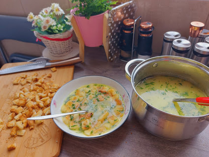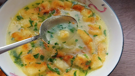 На уљу пропржити брашно па кад добије крем боју сипати 1.5 л воде. Пустити на тихо да ври. Додати бибер зачин лист першуна по жељи бели лук у гранулама. Сипати у тањир и додати коцкице хлеба.