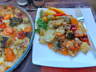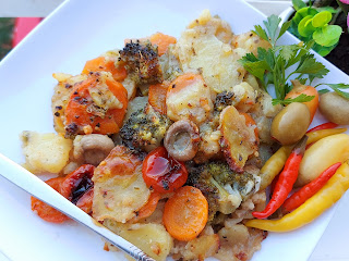 Тепсију подмазати уљем, па решетком поређати барен кромпир са поврћем и шампињонима. Кесицу инстанта за супу са печуркама измешати са водом (250 мл воде ) и прелити преко поврћа.