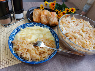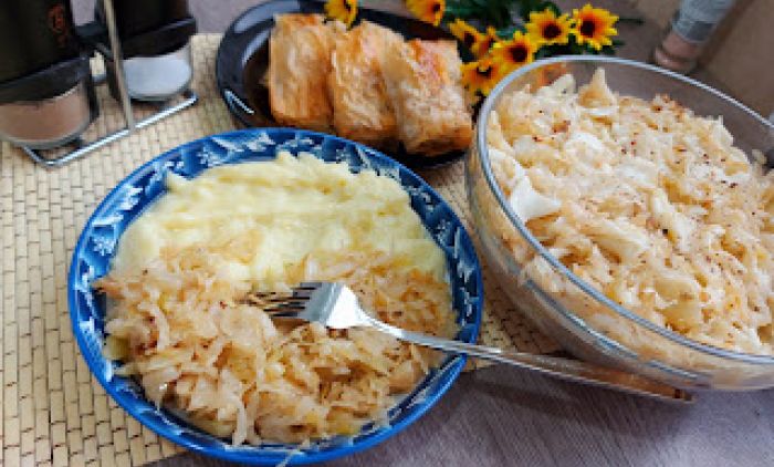 Кромпир скувати па га изгњечити и добро измиксати. Посолити Изгрејати кашику маслиновог уља па прелити кромпит. Добро измешати. У тањир ставити кромпир па лепо раширити. Додати пржен купус.