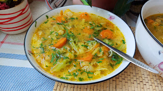 Додати одмах зачин и налити водом. Кувати 20 минута, па додати шаку броколија и опран пиринач. Кувати још 10 минута. Убацити сецкан першунов лист и млевени бибер.