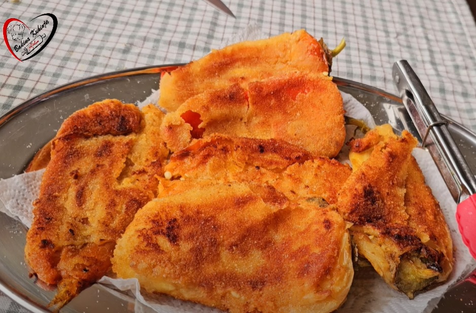 Паприку испећи и огулити . Оцедити вишак течности. Посолити а јаја умутити,