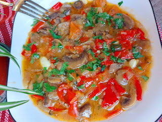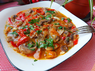 Додати паприку, па је упржити и на крају додати шампињоне. Динстати да уври течност, па убацити парадајз. Још пржити пар минута. Насецкати бели лук, першунов лист. Још мало посолити. Ручак је готов. Можете га јести и уз барен кромпир. Пријатно!