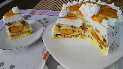 У млеко ставити шећер и ванилин шећер, па кад проври додати пудинг, скувати га па добро охладити и у њега кад се охлади додати умућен маслац или маргарин.. Брескве ољуштити и пресећи на пола. Охлађен бисквит исећи на тање ролате.