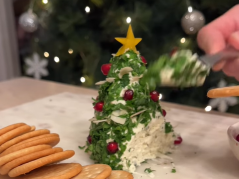 Припрема: У пластичној фолији обликујте крем сир у облику купе како би подсећало н ајелку, а затим га обложите насецканим першуном. Око јелке поређајте листиће бадема, и зрна нара, а од жуте паприке направите малу звезду за врх. Можете служити уз слане крекере, или сухомеснате производе, као пређело.
