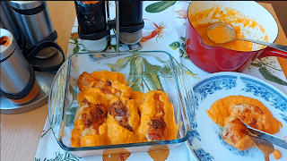 Штапом за блендање изблендирати. Шницле извадити у тацну и прелити сосом. Можете посути першуновим листом.