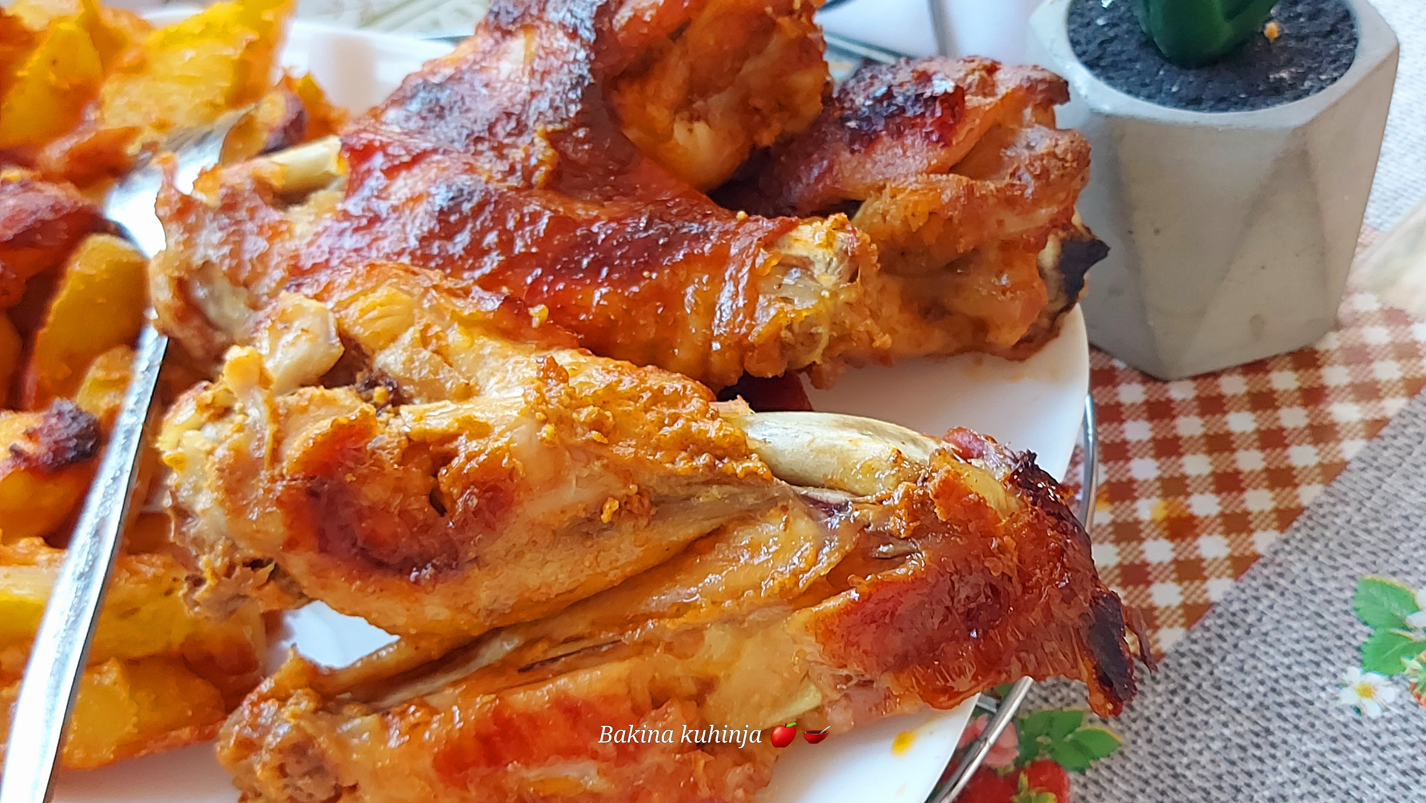Поређати у плех обложен пек папиром. У чинију где су била крилца насећи кромпир и измешати. Ставити поред меса или испод, како желите.