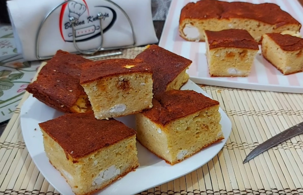 Убацити јогурт, уље, брашно једно и друго просејано са прашком за пециво. Све добро изједначити