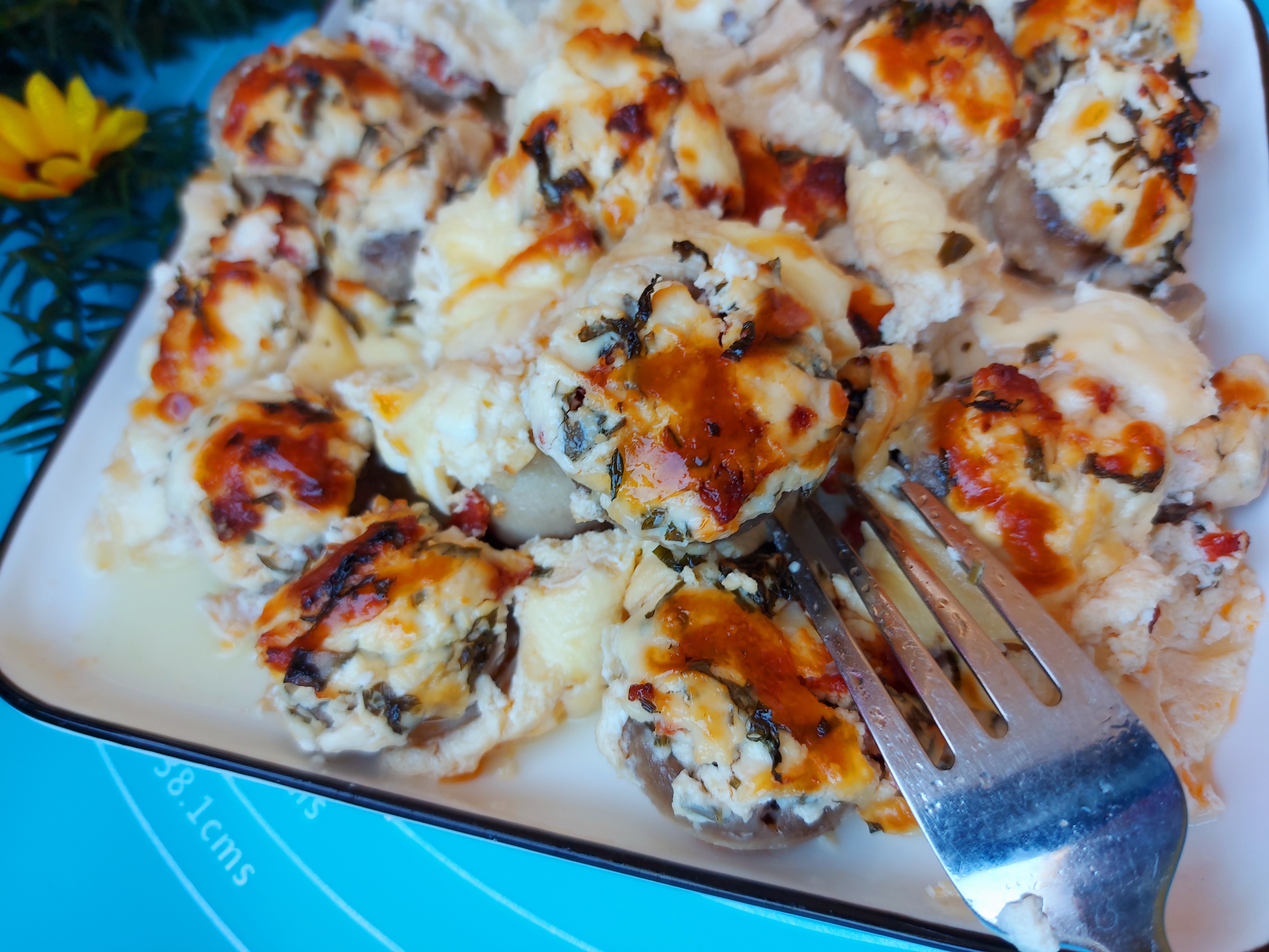 У чинију додати киселу павлаку, јогурт качкаваљ и јаје и све изједначити. Сипати у тепсију између шампињона и пећи на 200 степени Ц око 40 мин.