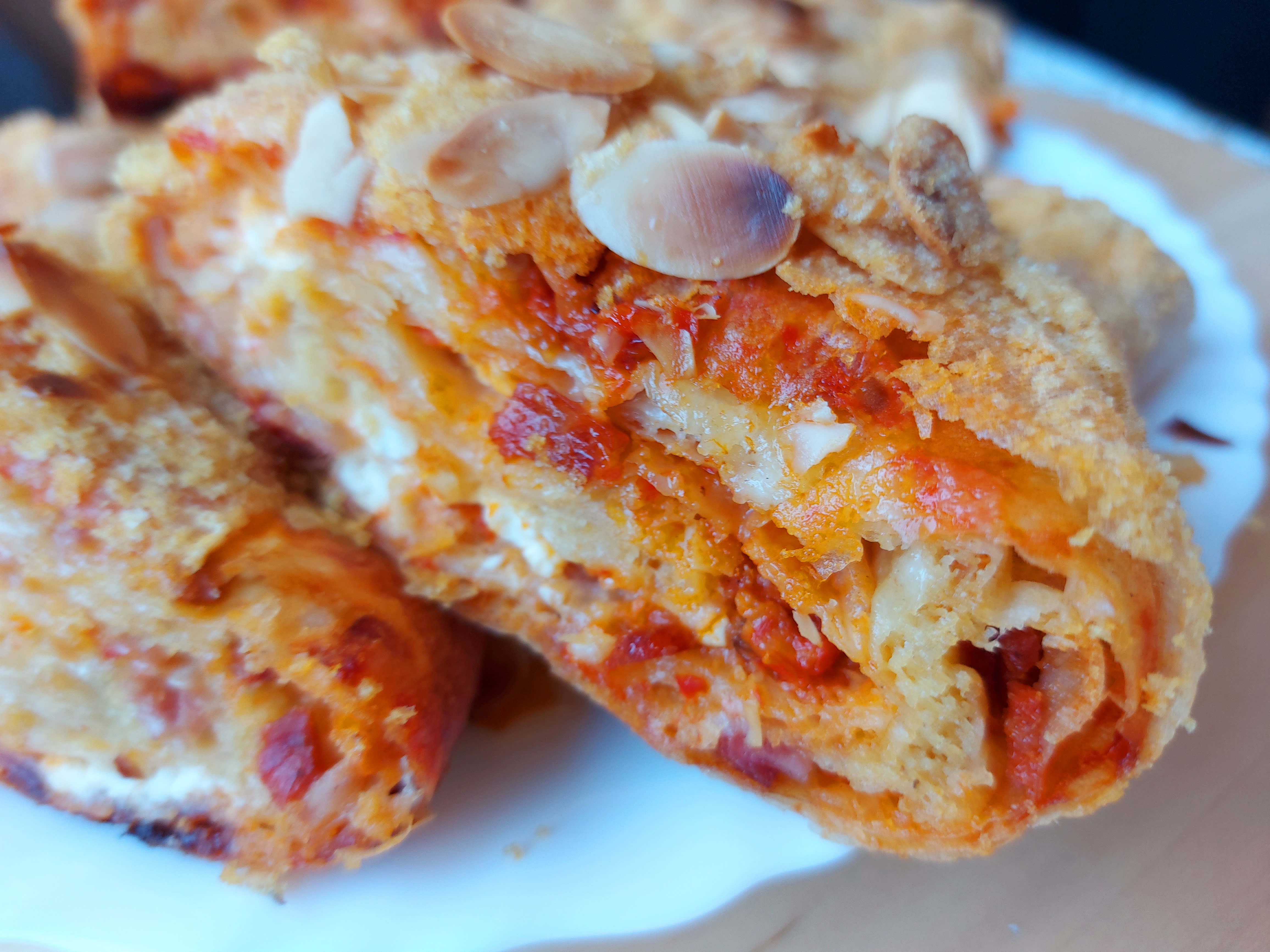 Додати шунку сир и качкаваљ на крају додати још једну кору и премазати ујајима савити странице и увити. Премазати остатком смесе јаја и гриза и посути по жељи љуспицама бадема.Пећи на200 степени око 45 минута.