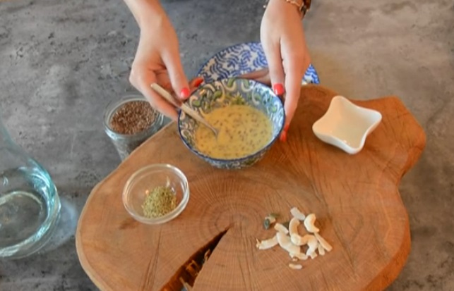 У брашно (две чаше од јогурта) сипајте мало мање од кафене кашике соли, додајте мало воде (око 150 мл). Треба да добијете благо густу смесу (више вуче ка течном, а семенке лана ће дати остатак потребне густине).