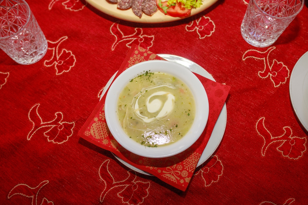 Додајте зелен (шаргарепу и корен паштрнака) у литар воде, 100 грама бамије, по 300 грама телећег и пилећег меса исеченог на коцкице и 2-3 листића ловора. Кувајте 2-3 сата. Додајте воду по потреби. Када је поврће и месо готово, направите у другом суду светлу подлогу за сос од маслаца, кашике брашна с мало воде и млека уз додатак соли и бибера. Пребаците то у лонац с поврћем и месом и лагано мешајте док се не згусне па, уз стално мешање, додајте умућену павлаку и 1 јаје. Када је све готово, додајте мускатни орашчић. Пре сервирања, чорбу обилно поспите ситно сецканим першуном и накапајте лимунов сок. Лимун обавезно сервирајте посебно ако неко жели накнадно да га дода у чорбу. Пријатно!