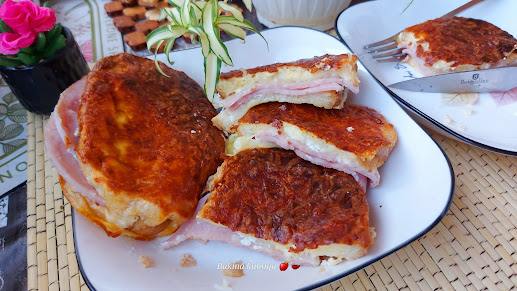 Умутити и посолити јаја, додати јогурт. Кришку хлеба премазати мало са павлаком, ставити два колута шунке, па преко додати мало парче сира по жељи, па друго парче притиснути хлеб и натопити у јаја и ређати у плех обложен пек папиром.
