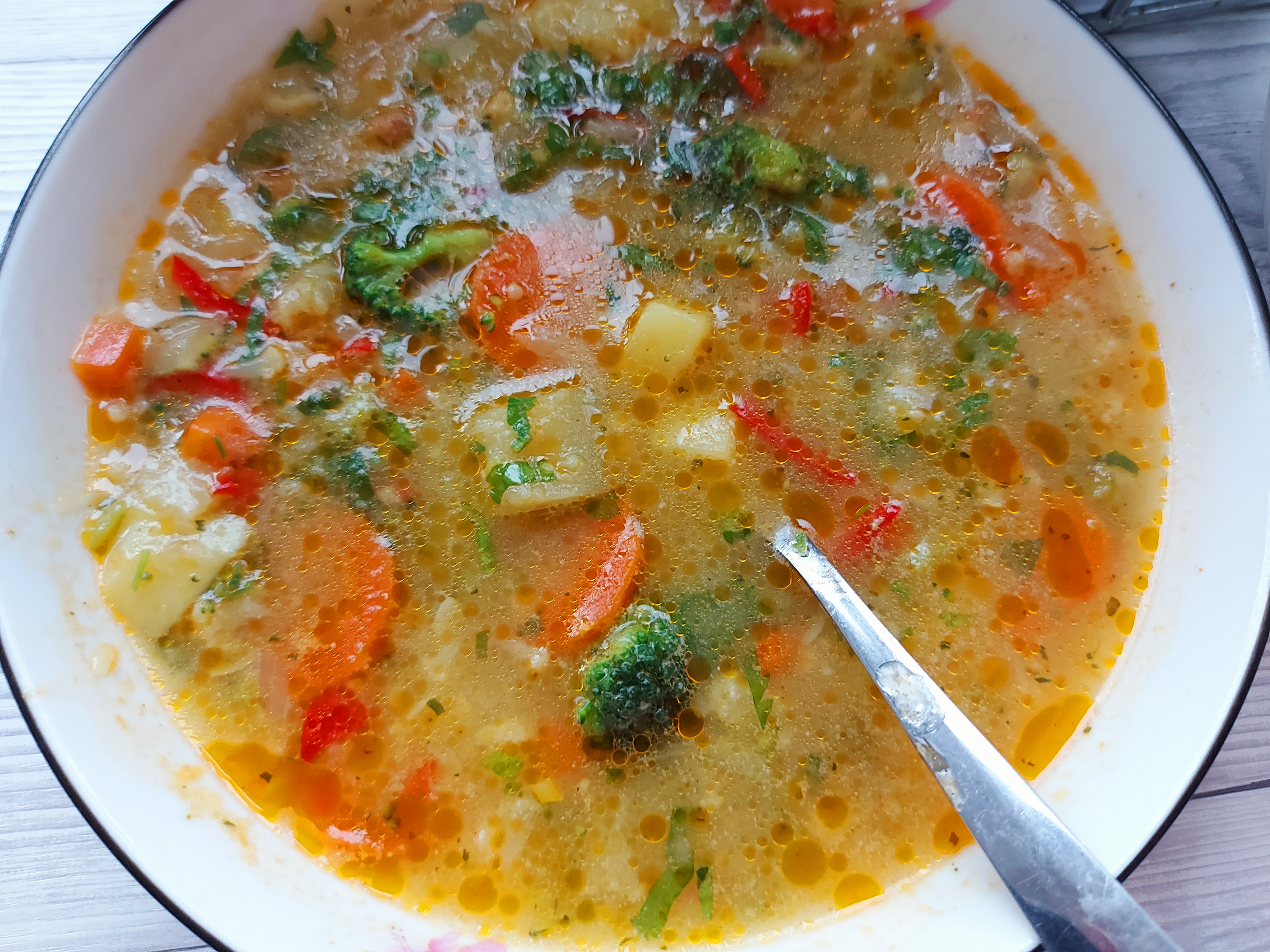 Испржити сецкану главицу црног лука, сецкану паприку и сецкану шаргарепу, па додати остало поврће и на крају кромпир на коцкице. Налити воде и кувати 20 минута. Додати суви зачин, млевени бибер...