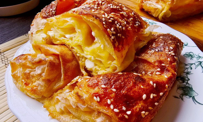 На последње савијање убацити по дужини мало сира. Пресавити узани део (а то је трећина коре) док не добијете фину ролницу. Ређати у подмазан плех. Можете премазати остатком надева и посути сусамом по жељи. Пећи на 200 степени Ц око 30-40 минута да лепо порумени.