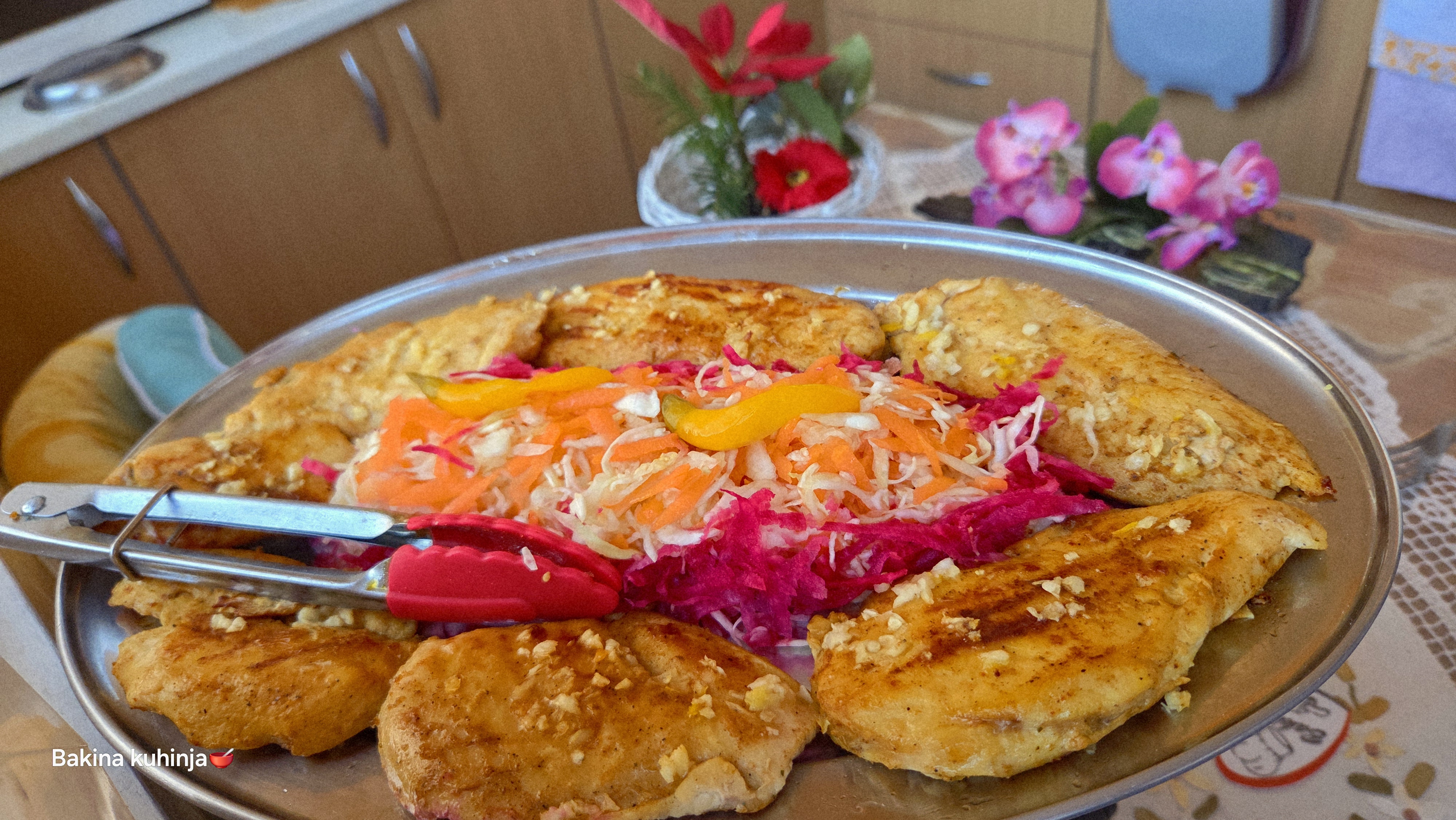 Оставити још минут под поклопцем да месо упије мирис лука, па сервирати на овалном тањиру уз брег од свежег купуса, рендану шаргарепу и ивице украшене крупно ренданом цвеклом.