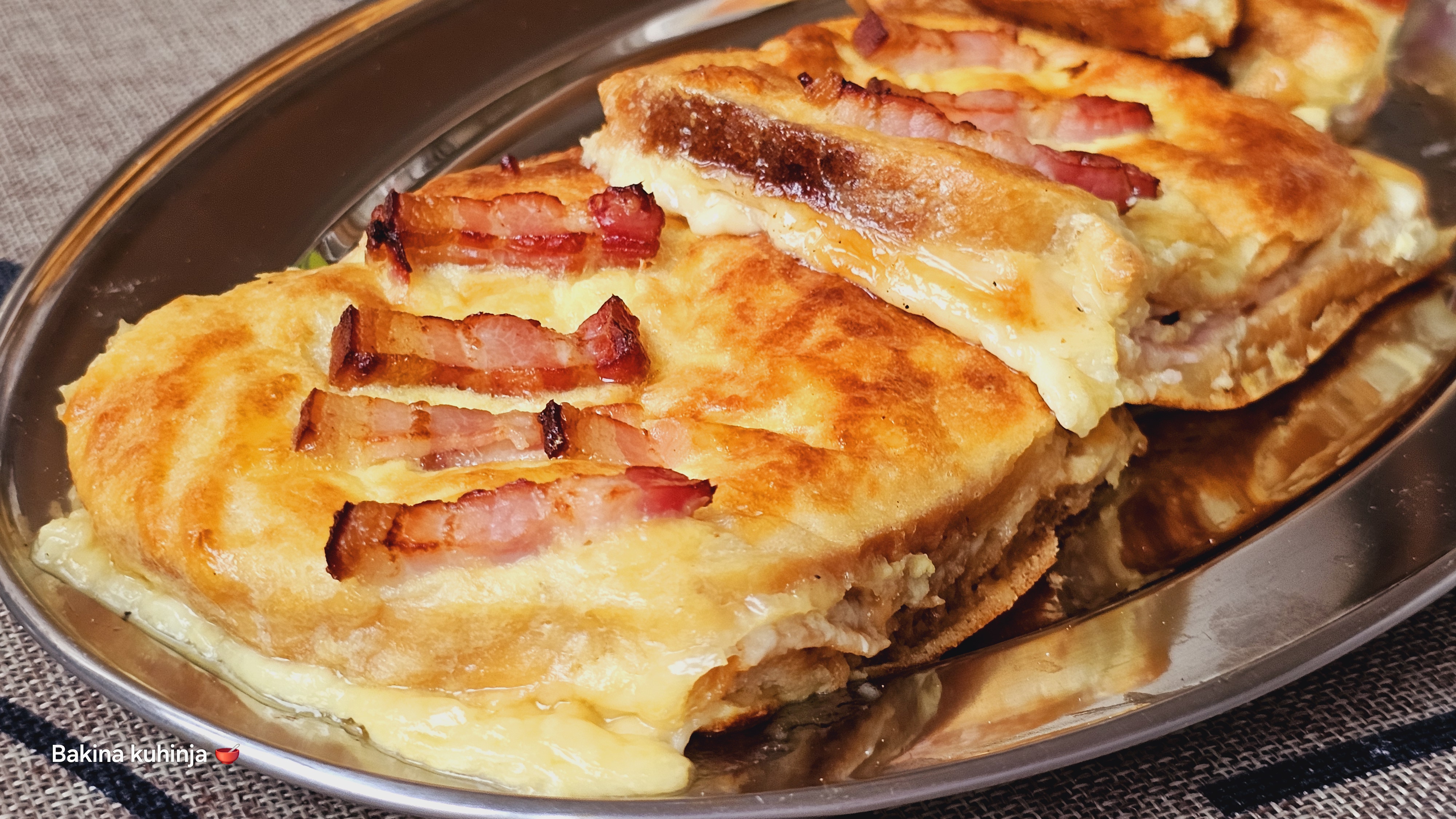 Сендвич натопити са једне и друге стране у јаја па редјати у плех обложен пек папиром. одозго по жељи додати мало суве сланине на коцке. пећи на 200 степени Ц 30 минута. Фантазија.