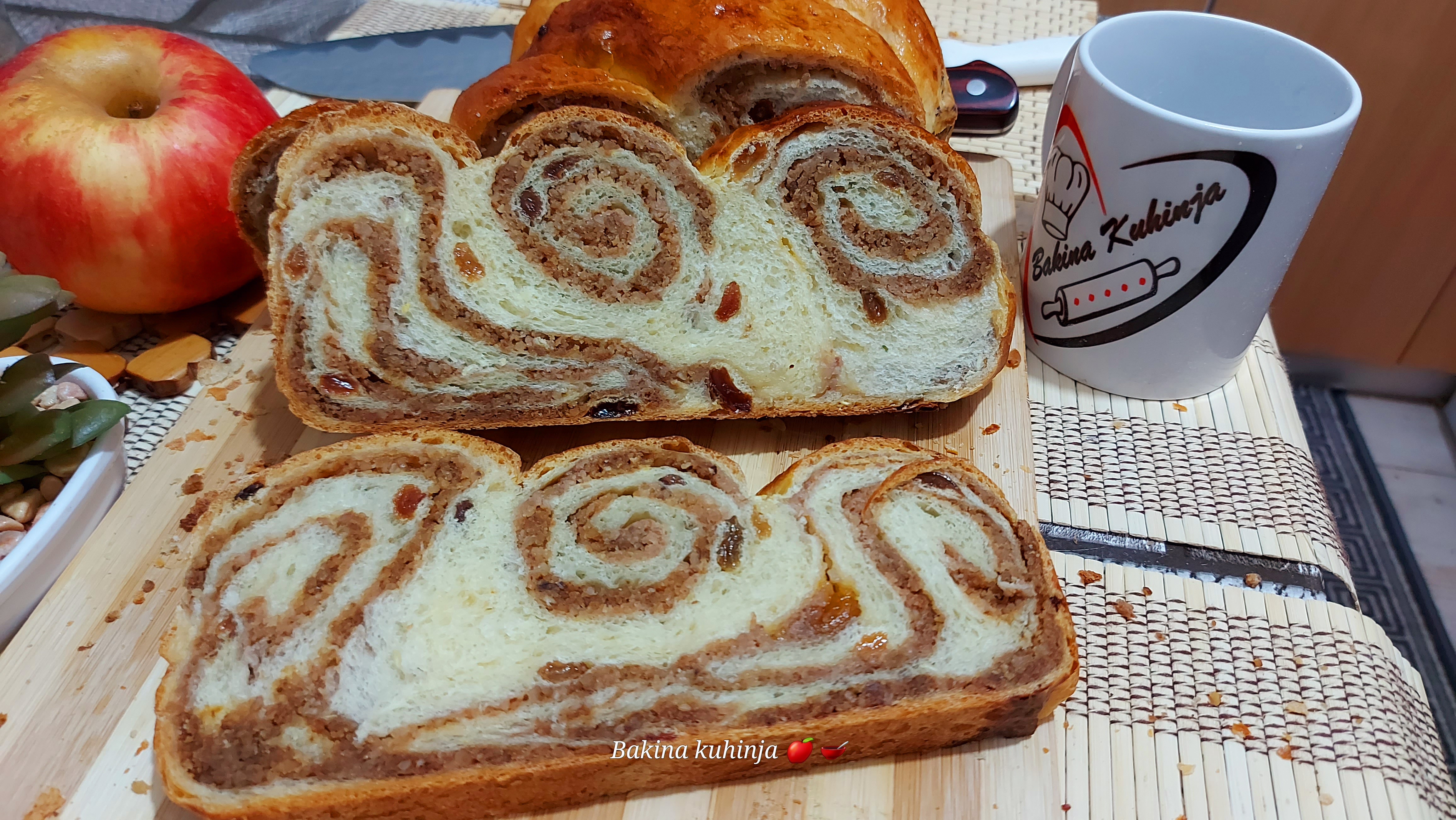 Увити у ролат. Тако урадити и са другим делом. Први део ставити на сто, па другу ролницу ставити на средину и увити у плетеницу и ставити у плех. Кад нарасте премазати жуманцетом.
