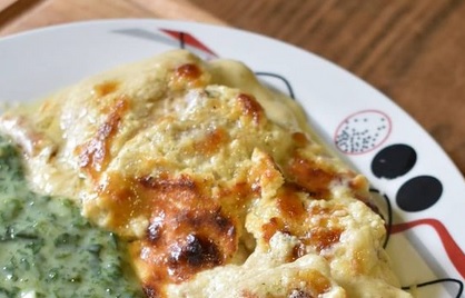 Бело месо исеците на шницле, посолите, побиберите, излупате туцком. Ватросталну посуду премажете маргарином или путером. У плитки тањир сипате смесу крем супе од печурака и у њу уваљајте шницле. Затим поређате шницле на дно посуде, преко ставите шунку па рендан качкаваљ. Поновимо поступак.