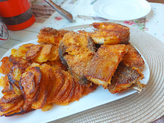 Порејдати у подмазан плех. Рибу посолити.. Измешати дукурузно брашно, хлебно паприка млевена слатка. Провући рибу кроз ту смесу и поређати у плех и мало премазити уљем и пећи на 220 степени Ц око 50 минута.