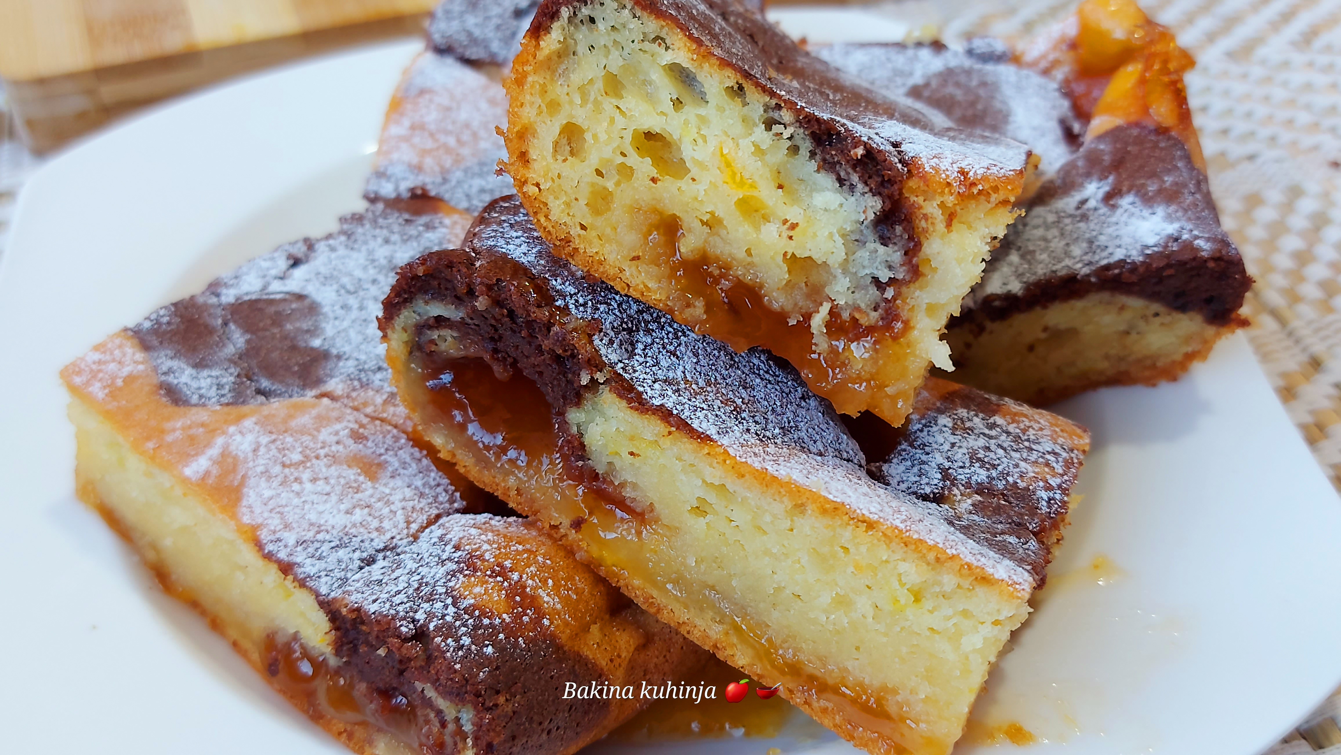 Умутити јаја, додати брашно и прашак за пециво, убацити уље, млеко и све изједначити и одвојити 1/3 и додати какао и изједначити.