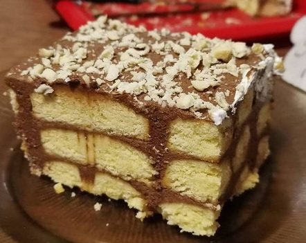 Фил такође поделите на три дела. Први део чајних колутића умочите у сок од наранџе и ређате као подлогу, затим ставите један део фила, преко њега поново ређате умочене колутиће, затим фил, колутићи, фил. Торта је готова. По жељи украсите је шлагом. Торта је брза, једноставна, изврсна. Пријатно!