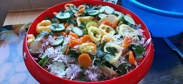Све поврће опрати и исечи на колутове, а купус на танке резанце. Шаргарепу мало бланширати ( око 5 мин) охладити па и њу исећи на кругове.