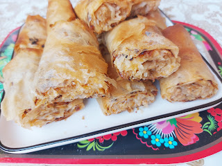 Ређати у подмазан плех. Све до утрошка материјала.. Исећи мало ножем на ролате, па пећи на 200 степени Ц око 35-40 минута. Служити топло.