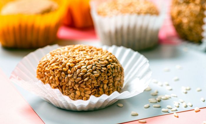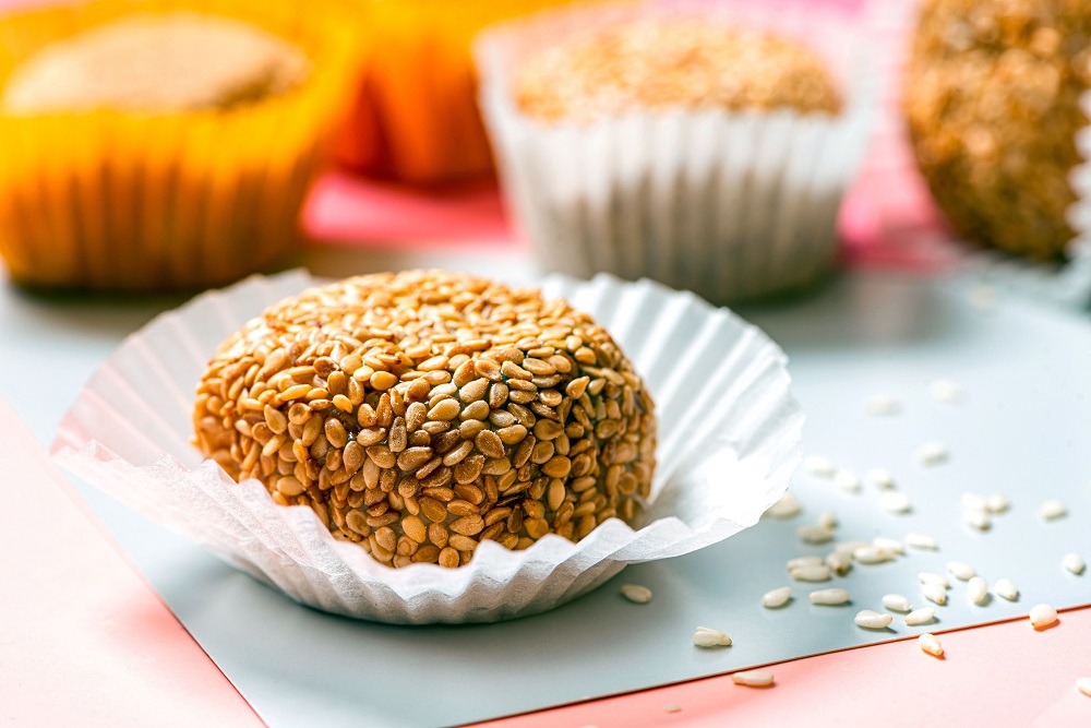Затим тесто пребаците на радну површину, коју сте благо посули пиринчаним брашном, и направите ваљак пречника 3 цм, који ћете поделити на девет једнаких делова. Сваки део равномерно истањите у облику круга пречника 6-7 цм. На средину ставите лоптицу фила, слепите ивице и рукама обликујете у лоптицу, па уваљајте у сусам.
