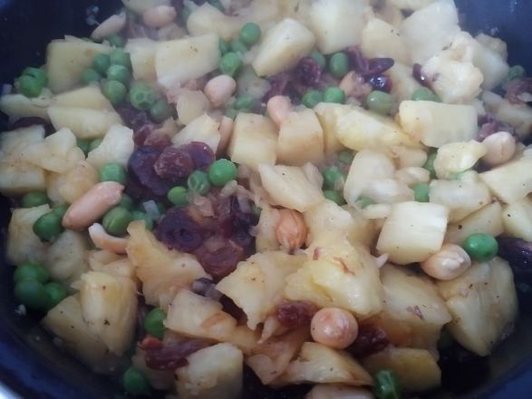 Бело месо се исече на коцкице и пропржи док не порумени, па извади из тигања. Најбоље је пржити у воку или дубљем тигању. Убаци се ситно исецкан црни лук са грашком и индијски орах. Дода се исецкан ананас и пропржи, а чим добије боју - готов је. Умеша се и суво грожђе, па испржена пилетина. Све се добро посоли и побибери према укусу.