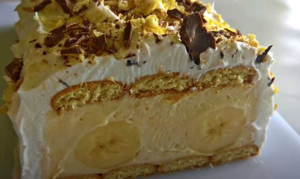 Прелити соком од једног лимуна да не потамне. На тацни поређати први слој пишкота, које су претходно умочене у хладно млеко. Преко пишкота премазати једну половину крема од ваниле. Банане поређати у супротном смеру од пишкота преко крема.
