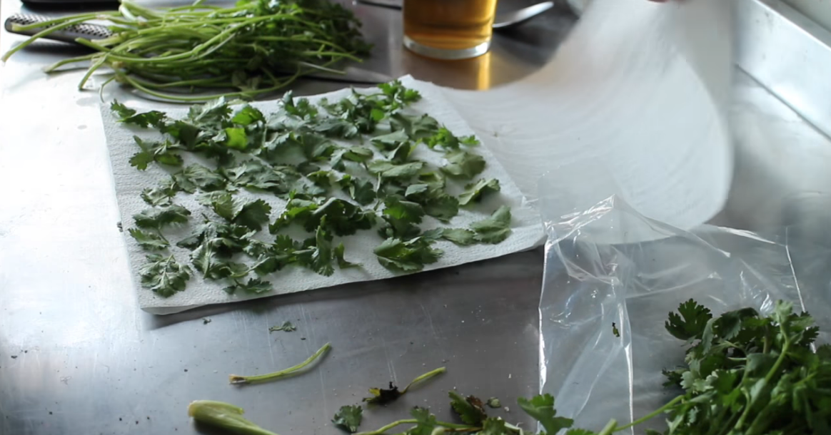 Ставите 1 папирнати убрус равно на тањир. Положите листове босиљка у један слој на папирни убрус. Ставите још један папирни убрус на врх.