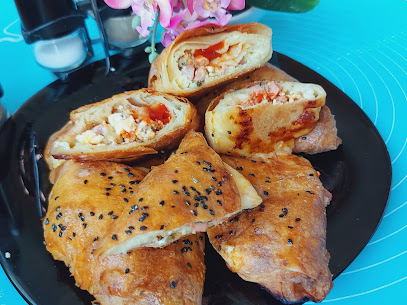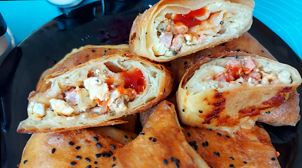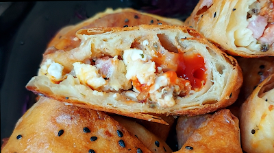 Још мало премазати јогуртом доњу страницу. Ставити кашику сира. шунку исећи на коцкице. Додати кечап и оригано. Преклопити горњи део преко сира. Савити у троугао као што је приказано у видеу. Премазати тоуглиће уљем може и жуманцетом и посути сусамом. Пећи на 200 степени Ц 40 мин.