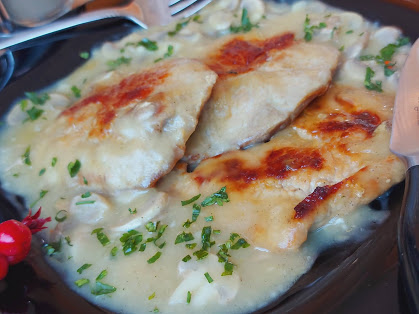 Пржити да порумени, па улити 200 мл белог вина и 200 мл воде. Убацити сецкане шампињоне, додати соли бибера и вратити шницле у тигањ да се крчкају са шампињонима. Поклопити.