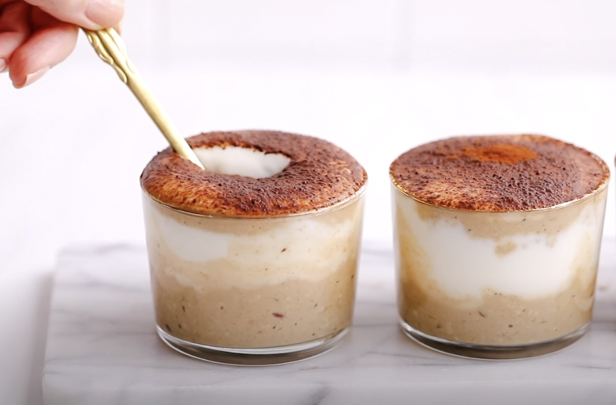 Оставите овсене пахуљице у воду или млеко да се мало омекшају. Помешајте све састојке и ставите у чинију или теглу. За прелив помешати јогурт и јаворов сируп, па кашичицу ставити на мешавину од овса. Ставити у фрижидер преко ноћи. Пре сервирања поспите какао прахом. Резултат изгледа овако: