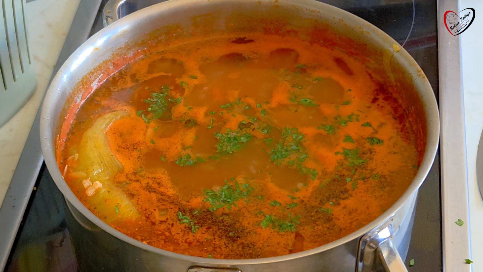 Затим додати опран пиринач и кувати још 15 минута. На крају зачинити сувим зачином, бибером и посути обилно свежим першуном.