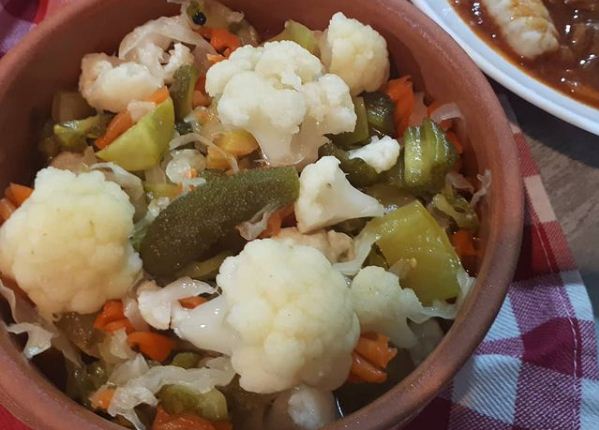 Све ставите у једну велику чинију, па налите са 250 мл алкохолног сирћета, 4 кашике шећера, две и по кашике соли, 15-ак бибера у зрну и 5 гр винобрана.