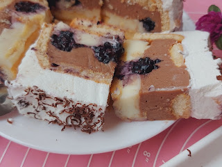 Мањи узан плех обложити прозирном фолијом . На дно ставити пишкоте а са стране кекс па убацити пудинг од чоколаде преко њега купине.