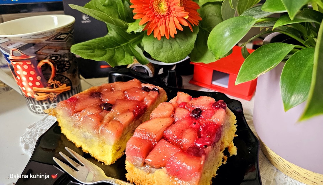 Плех обложити пек папиром, па поспите шећером, а преко на дно поређајте јабуке на коцице са циметом и воће по жељи као и банану на колутове.