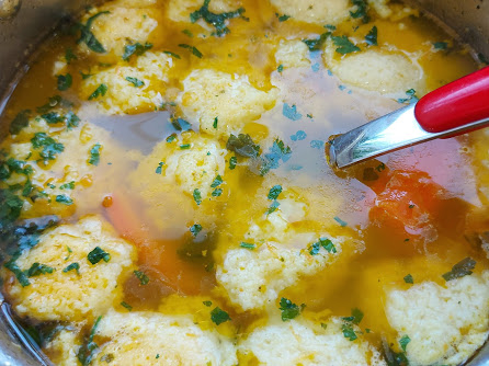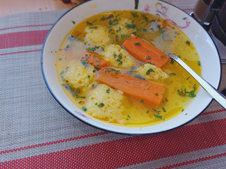 Додати 5-6 кашика гриза и полако окретати шпатулом и мешати. Изравнати, и оставити бар 30 мин да гриз набубри. Малу кашичицу умочити у супу и захватити мало гриза и спуштати у супу.