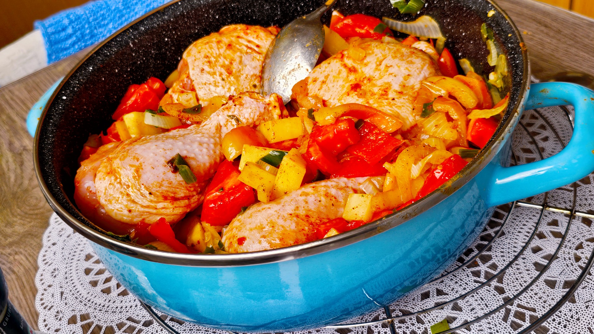 На уљу прпржити лук, сецкану паприку на крупније коамде, кромпир на коцкице. Додати суви зачин и измешатии млевени бибер. Кад се пропржи додати млевену паприку, слатку и љуту по жељи. Пилетину посолити, додати мало слатке паприке и зачин за пилетину, па све измешати рукама. Поређати месо по поврћу и покрити фолијом, ставити да се пече 30 минута на 220 степени Ц па открити још 30 минута да се запече. Ручак је готов!