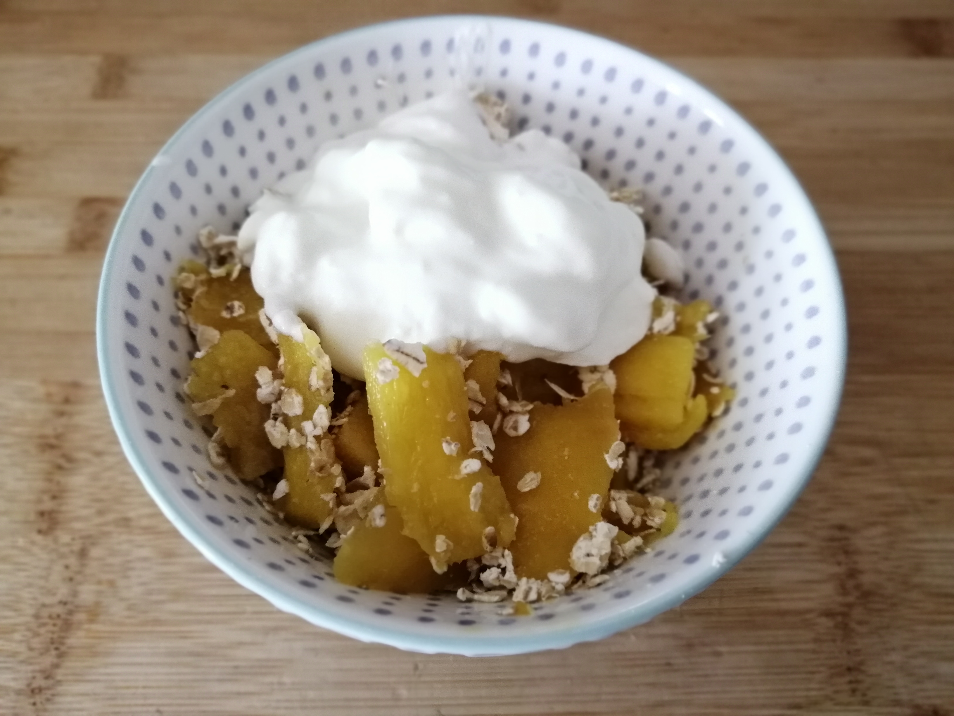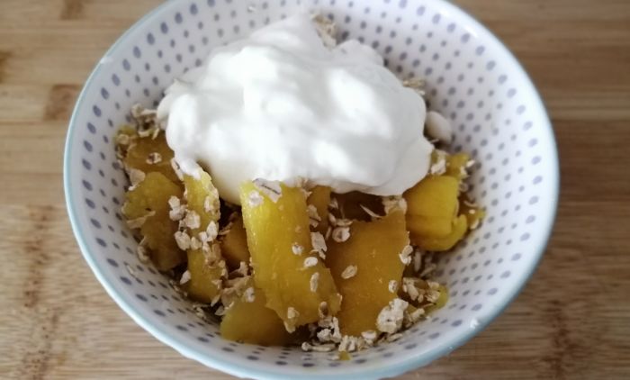 Кашика овсених пахуљица се помеша са бананом исеченом на колутиће, мангом исеченим на коцкицама, кришкама јабуке, вишњама или малинама, воћем према жељи, па се одозго сипа грчки јогурт.