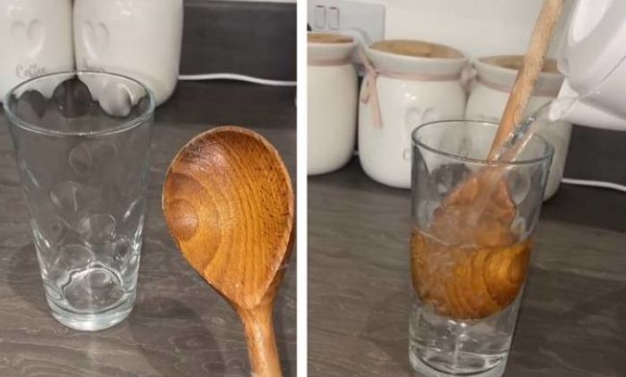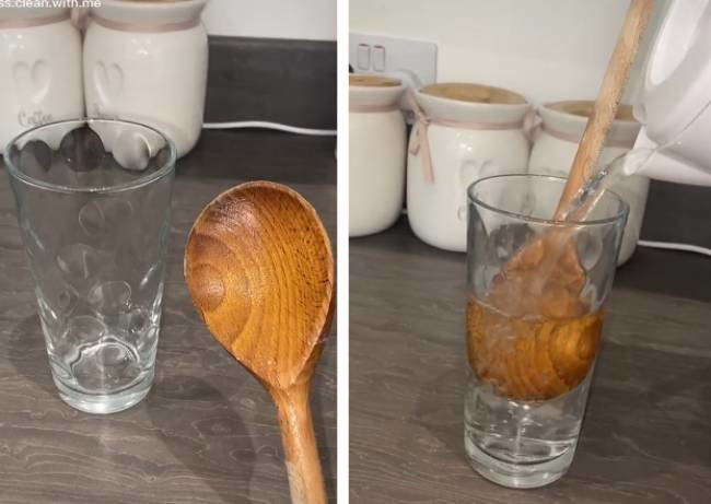 Показала је како своју дрвену кашику ставља у чашу са врелом водом и оставила је око 30 минута да одстоји. Након тог времена, вода је постала мутна и пуна честица прљавштине.