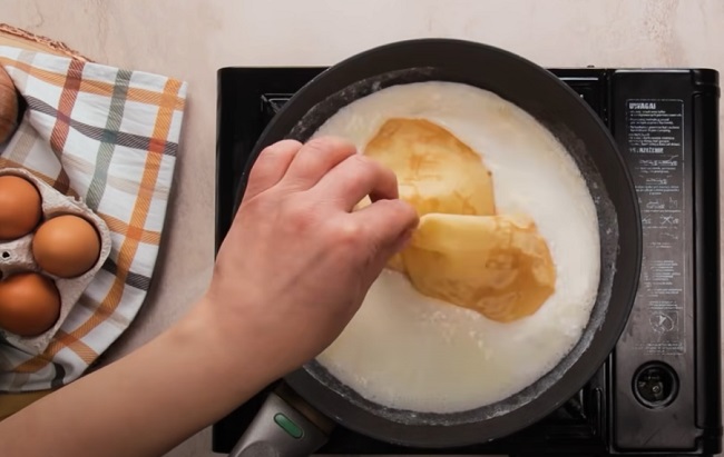 Умутите смесу за палачинке, испржите их нормално и потопите на кратко у претходно загрејан "сос" (отопљен путер у тигању у који се сипа млеко). Извадите тако натопљене палачинке и у загрејан тигањ са отопљеним путером их наређајте укруг (можете их пресавити у облик троугла). Преостали сос у који сте потапали палачинке, прелијте преко поређаних троуглића и поклопите. Оставите на слабој ватри 10 минута да се крчкају.
