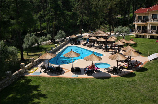 Хотел је окружен боровом шумом, собе имају поглед на море и стотинак метара је удаљена плажа. Наши туристи су смештени у апартманима, па поред обичних кревета имају и мале чајне кухиње. Међутим, то им није потребно, јер у хотелу добијају пун пансион.