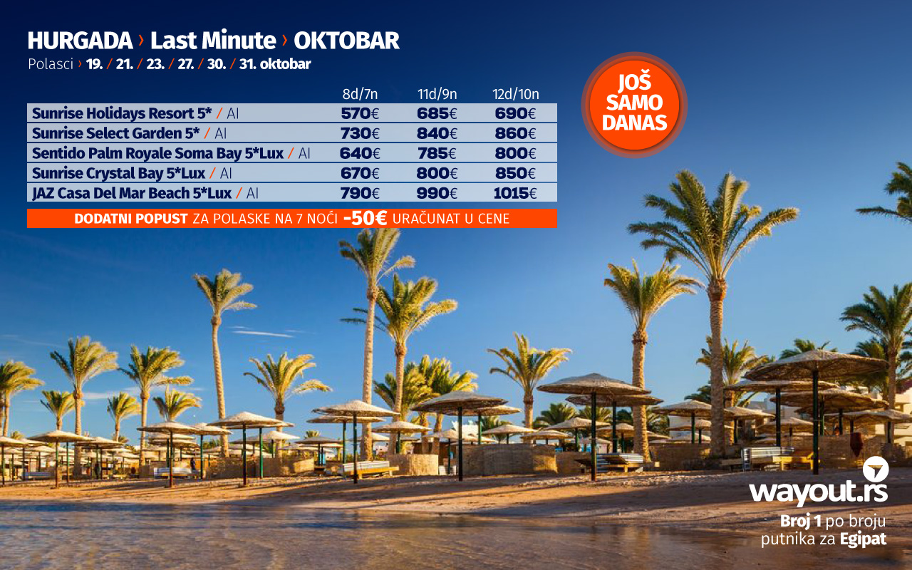 Пошто лето у Хургади траје током целе године, за све путнике смо спремили тоталну распродају аранжмана за најсигурније јесење путовање, а која обухвата Ласт минуте понуду за поласке у октобру, као и Специјалну понуду за поласке у новембру и Фирст Минуте понуду за поласке у децембру, јануару и фебруару са најповољнијим ценама аранжмана до сада и са највећим избором хотела на тржишту. Обзиром на то да ће Хургада и у наредним месецима бити једна од главних светских туристичких дестинација, свима препоручујемо да се што пре одлуче за жељени термин и жељени хотел, како би свој аранжман букирали пре путника из осталих европских земаља као што су Немачка, Румунија, Чешка, Пољска, Украјина, Русија, а све то за само 199еур по резервацији, док је остатак аранзмана потребно исплатити 15 дана пре путовања...