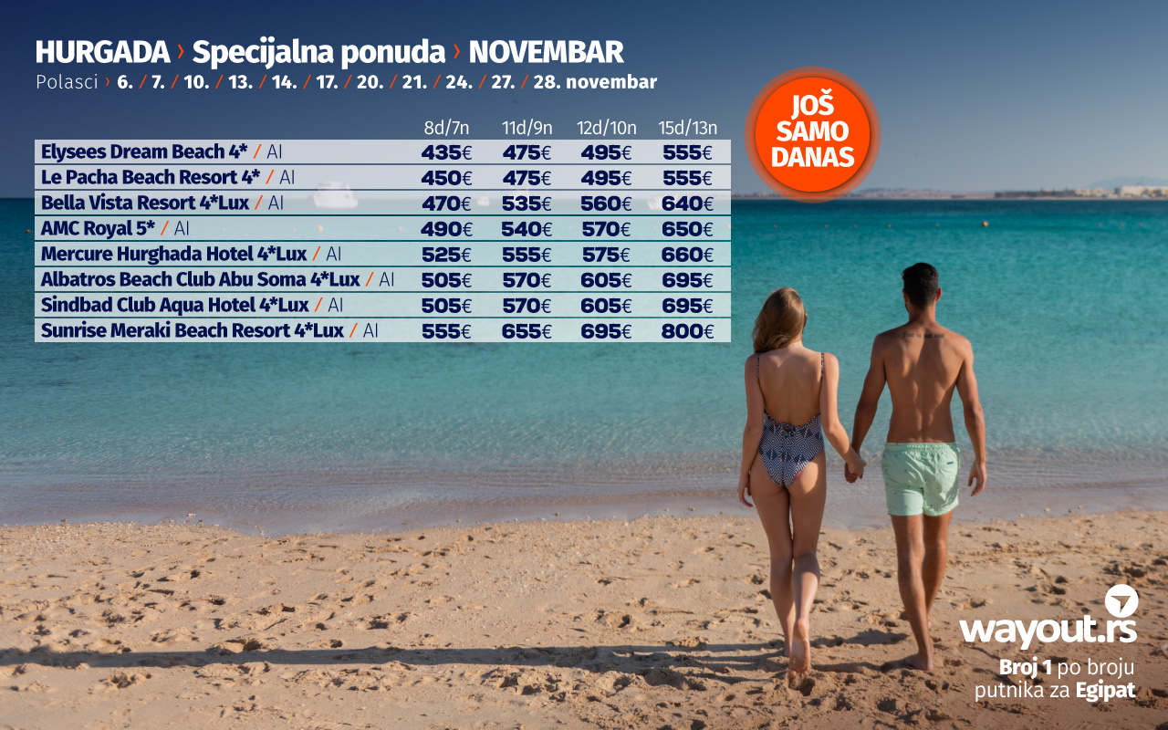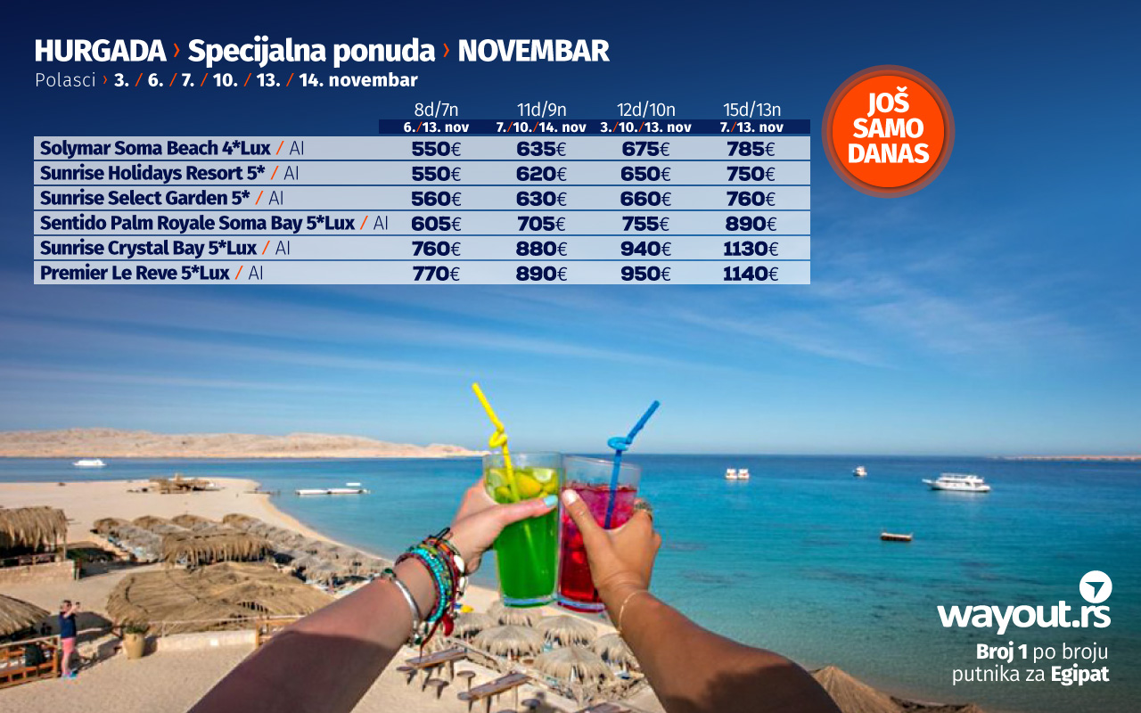 Један од показатеља да је Хургада једна од најсигурнијих туристичких дестинација, као и искуства путника који су прошле године, у време пандемије путовали у Египат, јесте то да су поједини хотели већ изашли са понудом за поласке у децембру, јануару и фебруару, а ми смо за све наше путнике издвојили најтраженије хотеле по специјалним Фирст Минуте ценама, а обзиром да је тражња за путовањима у Хургаду огромна, саветујемо да на време резервишете своје место и без стреса сачекате своје јесење путовање у новембру или децембру са најповољнијим ценама.