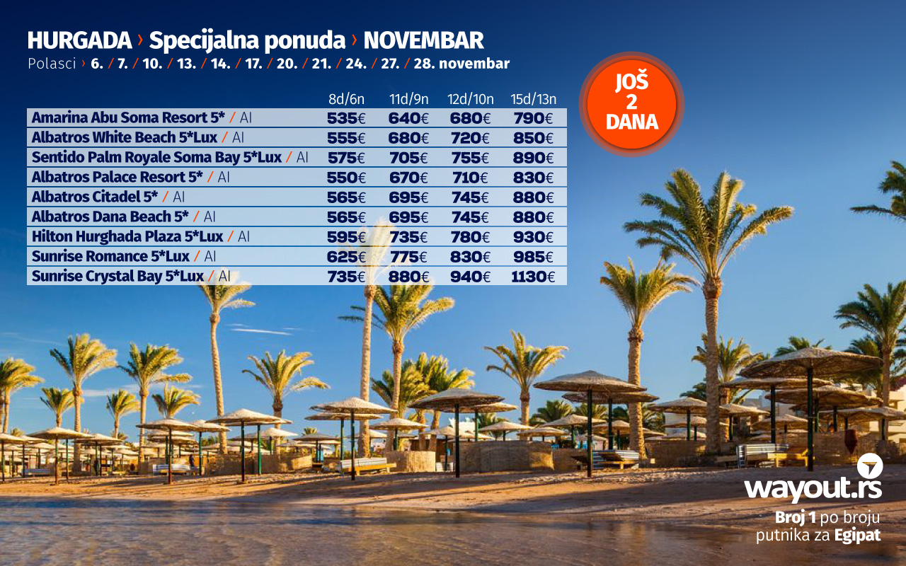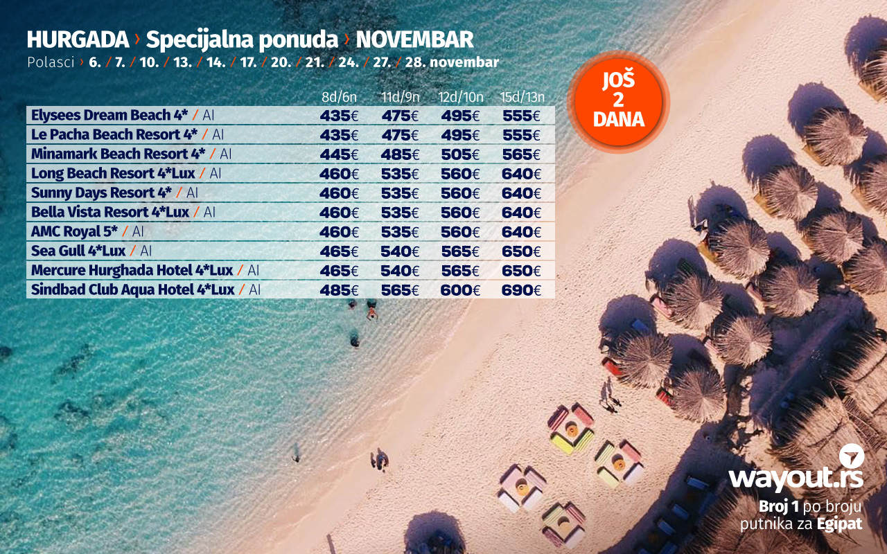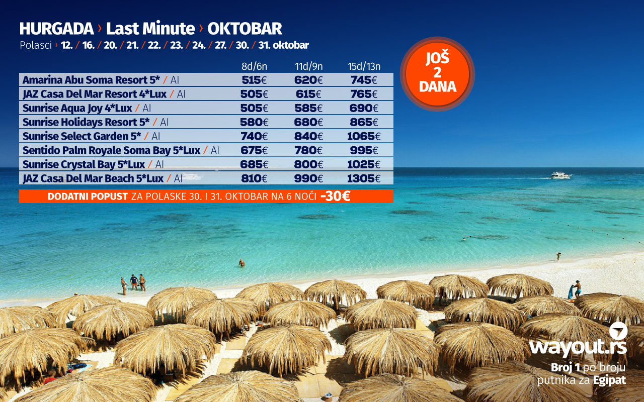 Уколико још увек нисте стигли да резервишете своје путовање, без много размишљања, дефинитвно, најсигурнији и најповољнији избор ове јесени је Хургада и одмор на прелепим плажама Црвеног мора, а за све оне који би да што пре побегну од свакодневних обавеза, спремили смо неодољиву LAST MINUTE која се односи на последња места, како у авионима, тако и у хотелима за поласке у октобру, као и СПЕЦИЈАЛНУ ПОНУДУ за поласке у новембру.