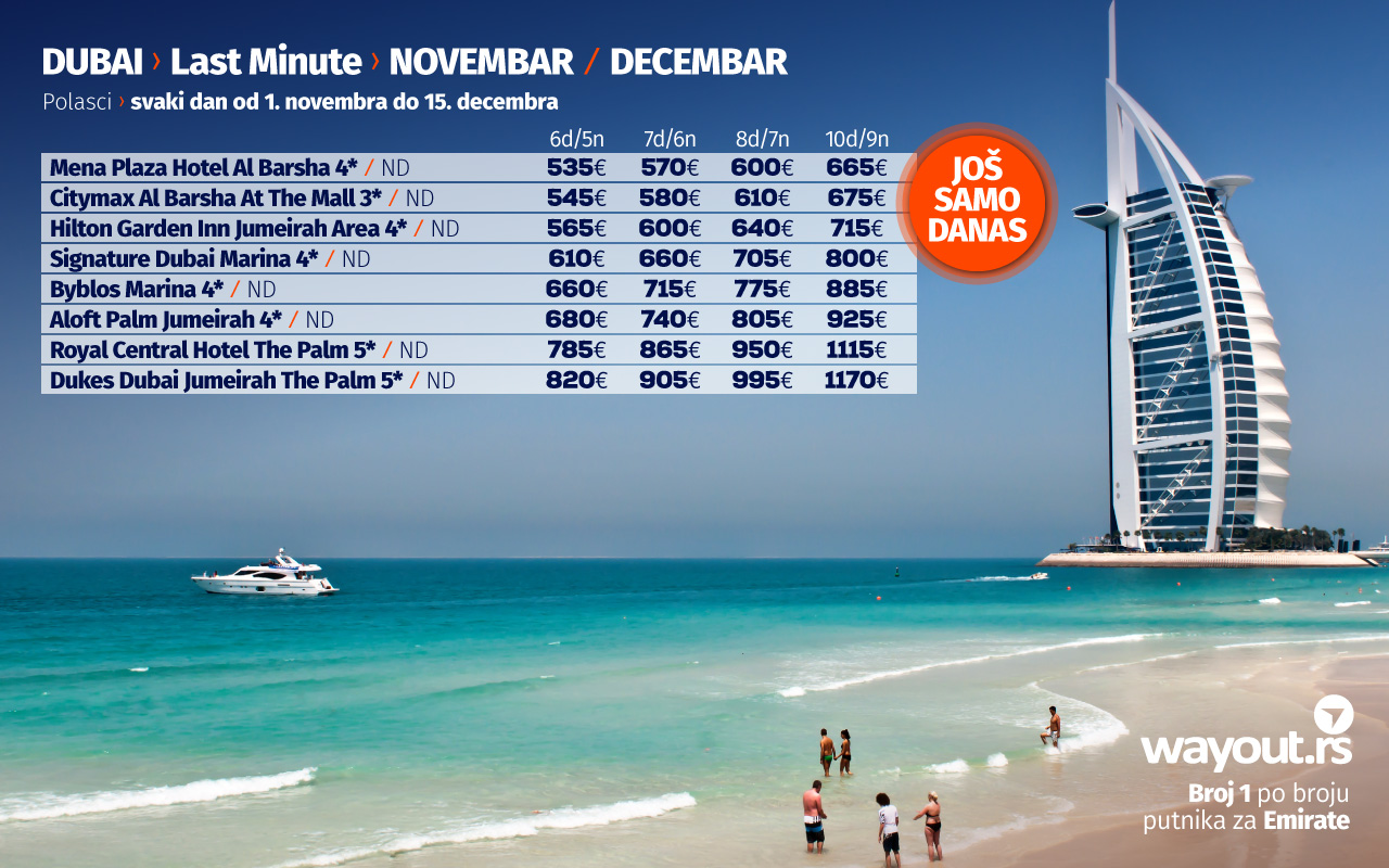 Обзиром на то да је у Дубаију 01. октобра почео највећи светски сајам EXPO 2020 који ће трајати 6 месеци, у Wayout понуди можете наћи и поласке у новембру и децембру ове године, а ускоро се очекује понуда за поласке у јануару и фебруару, као и пролећне поласке у марту и априлу наредне године.