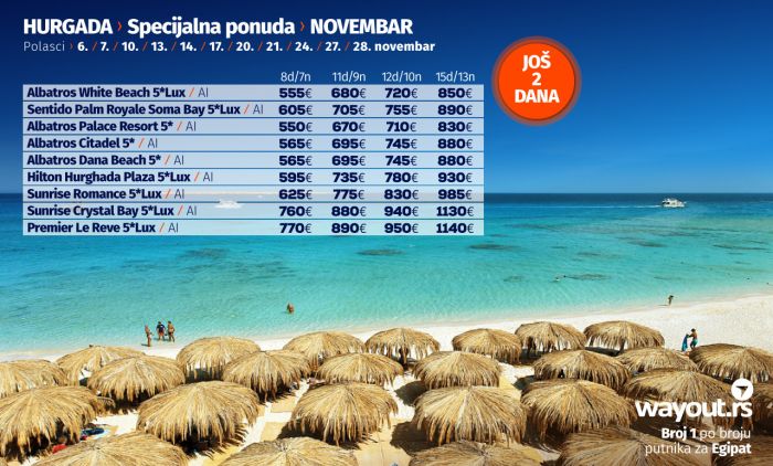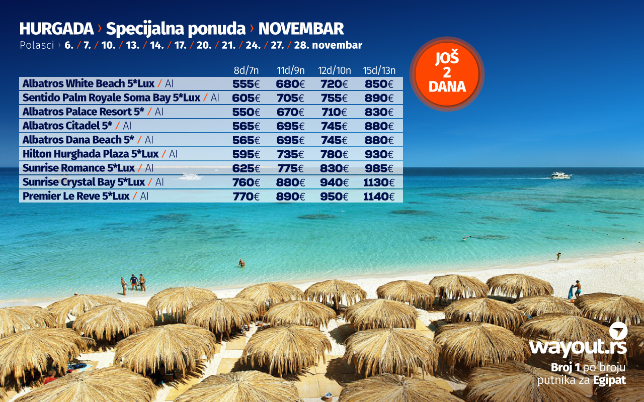 Уколико још увек нисте стигли да резервишете своје путовање, без много размишљања, дефинитвно, најсигурнији и најповољнији избор ове јесени је Хургада и одмор на прелепим плажама Црвеног мора, а за све оне који би да што пре побегну од свакодневних обавеза, спремили смо неодољиву ЛАСТ МИНУТЕ која се односи на последња места, како у авионима, тако и у хотелима за поласке у октобру, као и СПЕЦИЈАЛНУ ПОНУДУ за поласке у новембру.