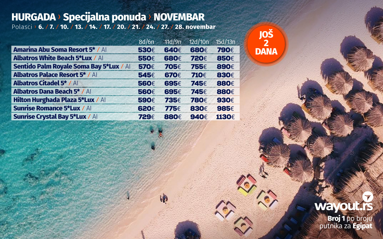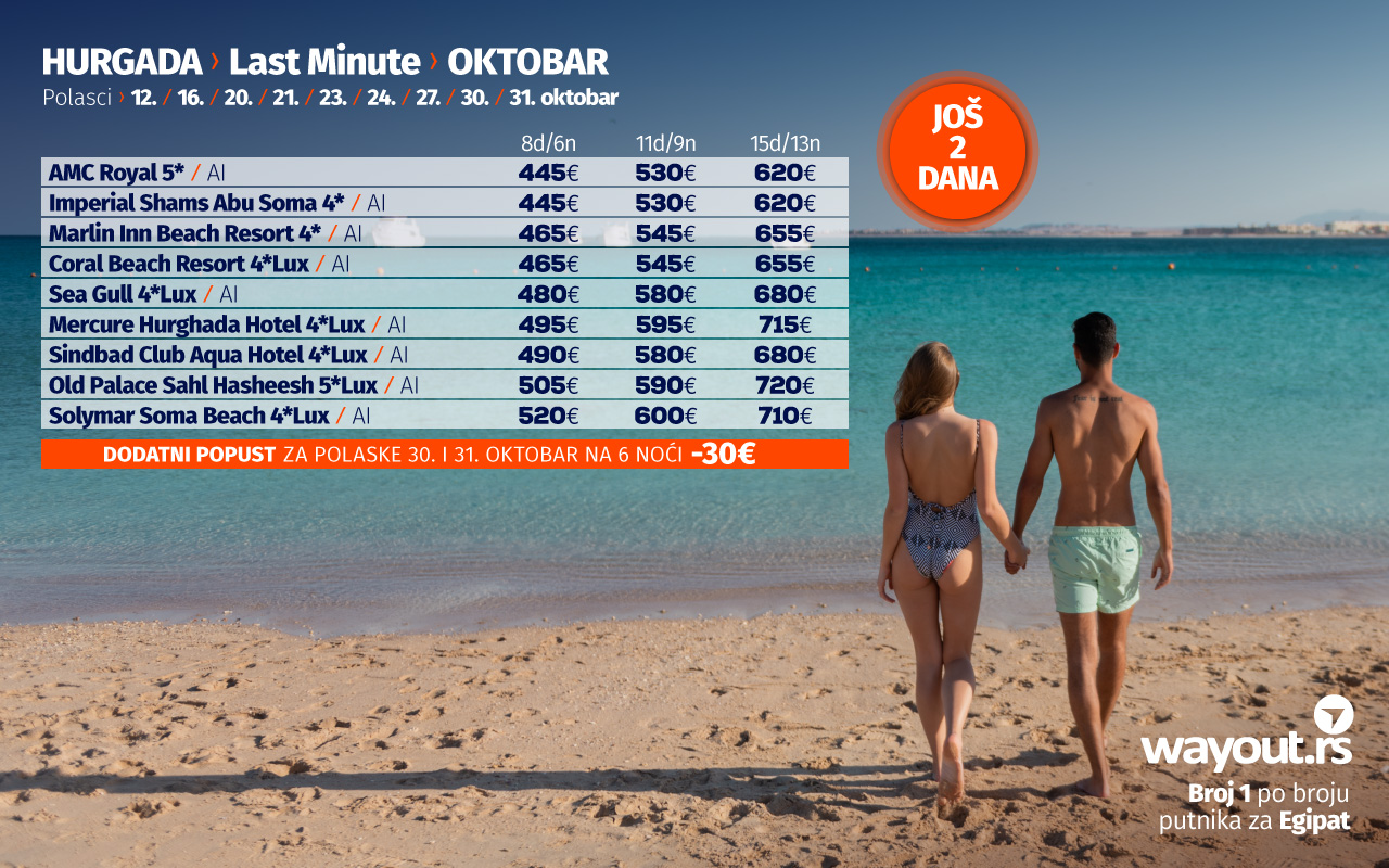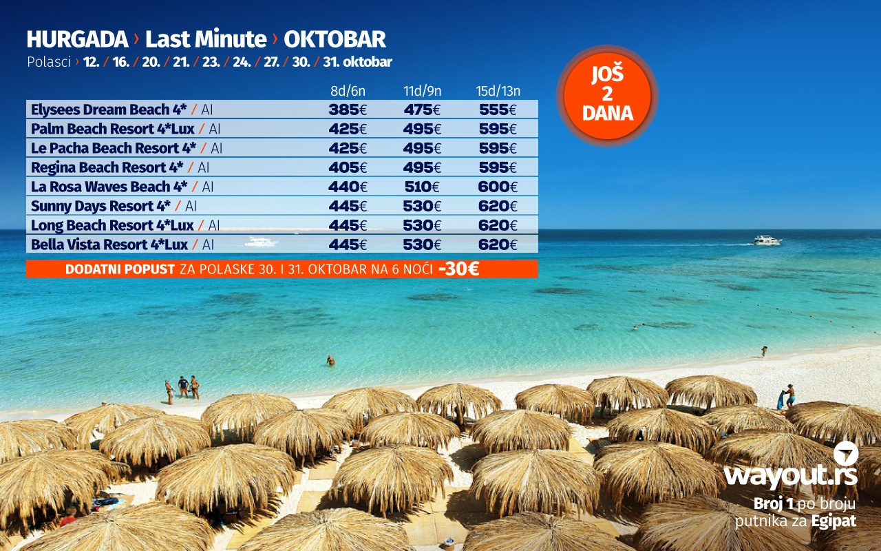 Уколико још увек нисте стигли да резервишете своје путовање, без много размишљања, дефинитвно, најсигурнији и најповољнији избор ове јесени је Хургада и одмор на прелепим плажама Црвеног мора, а за све оне који би да што пре побегну од свакодневних обавеза, спремили смо неодољиву LAST MINUTE која се односи на последња места, како у авионима, тако и у хотелима за поласке у октобру, као и СПЕЦИЈАЛНУ ПОНУДУ за поласке у новембру.